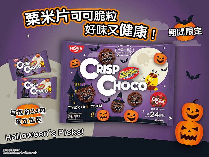 萬聖節將至,日清食品推出「日清迷你可可脆粒」萬聖節限定版。包裝採用巫師造型,並結合南瓜、蝙蝠等應節插畫,營造濃厚的節日氣氛,讓消費者一同體驗 Trick or Treat 的歡樂。